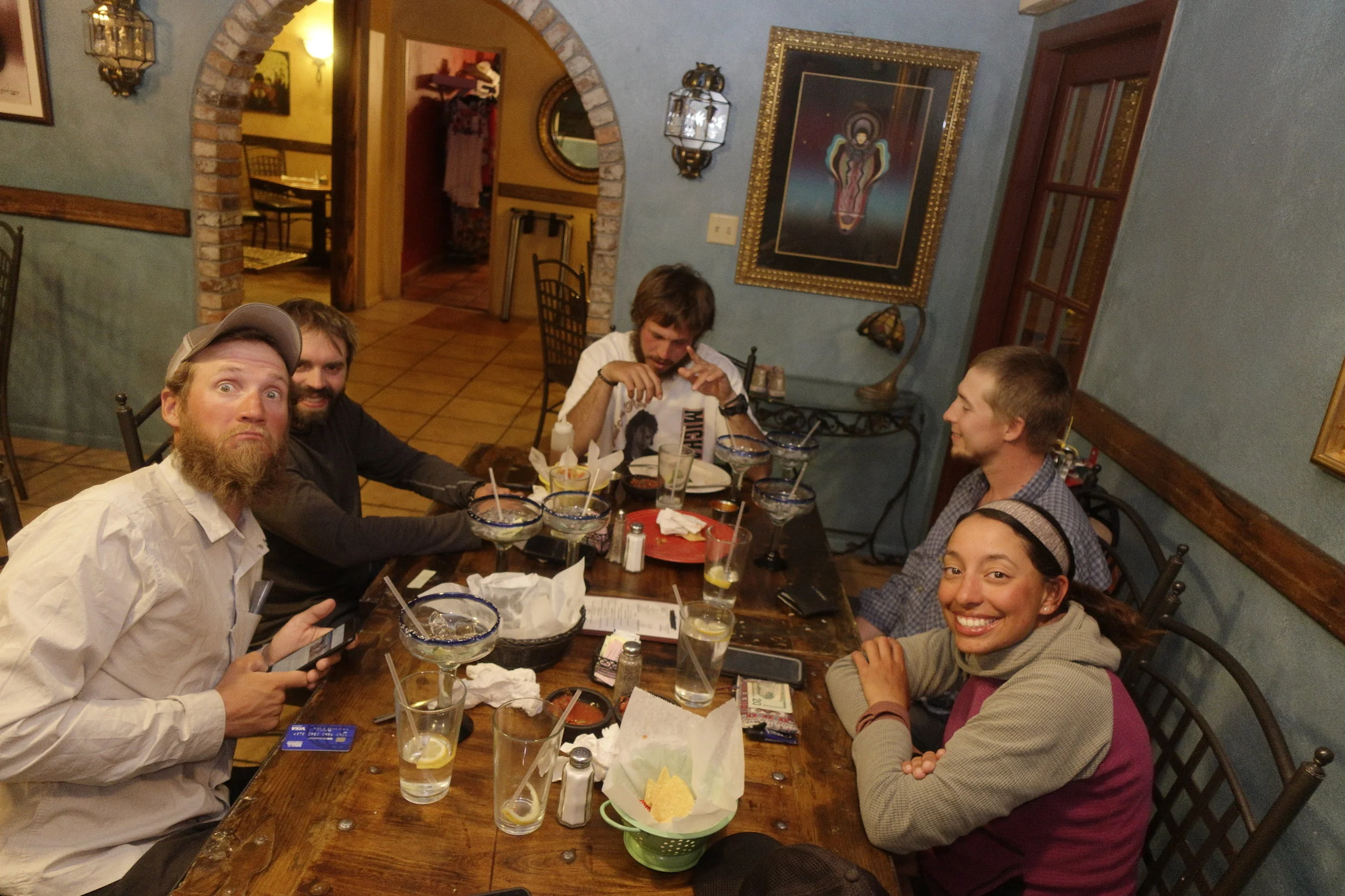 Back at the Del Prado I was happy to find the 4 adjacent rooms open and hikers lounging and drying everything in the sun. It was scene could be defined as straight up hikerThe Motel owner was mingling with everyone and offered me some Chinese food that she had just made, I ate it all happily after thanking her. I found that Sherpas birthday was today so we all planned to go to the El Bruno for dinner and margaritas at the end of the day. Mrs. Yang drove us all a ride to the restaurant for the celebration. Two women mountain bikers who biked in earlier in the day came out later, we discovered that they put in nearly 80 miles in today and are riding the 2768 mile Great Divide Mountain Bike Route (GDMBR).